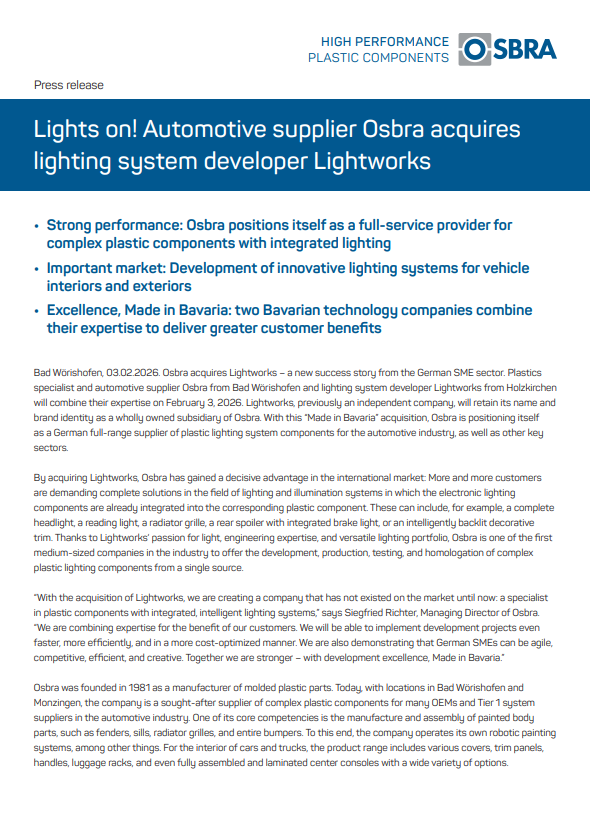 Press release: Automotive supplier Osbra acquires lighting system developer Lightworks!